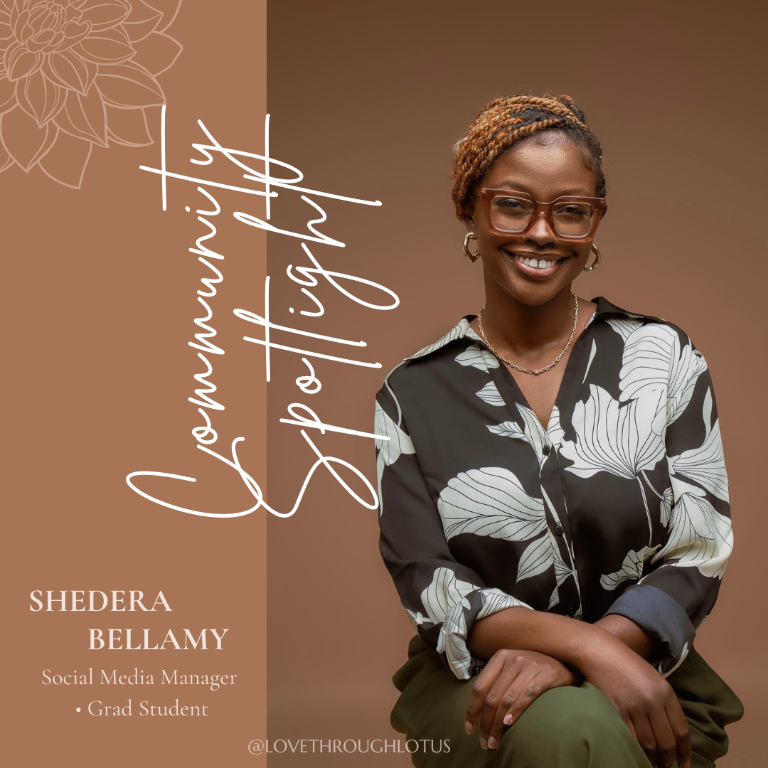 We’re excited to feature Shedera Bellamy in our September Community Spotlight! Based in Charlotte, Shedera is a dedicated Social Media Manager who focuses on creating safe spaces and unique experiences that foster authentic connections. She specializes in empowering local Black-owned wellness brands with the tools they need to thrive online. Shedera has elevated our Love Through Lotus profile and has also worked with Charlotte-based florist Perfect Bloomz, among others, all while pursuing her Master’s in Public Relations, Innovation, Strategy, and Management as a full-time graduate student.